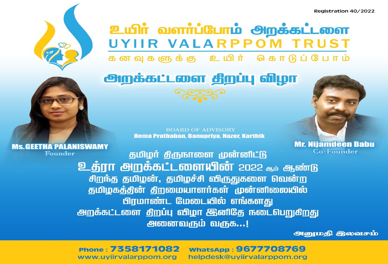 Uyiir Valarppom Trust is committed to empowering society and ultimately building a healthy, happy, and progressive society in which every citizen lives with dignity and has equal opportunities.